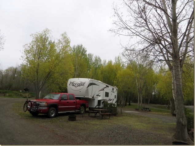 When we were here a couple of years ago in the spring the creek was threatening to overflow it’s banks and we left and went up to Clinton where it snowed! It had snowed in Williams Lake and we were laying over a couple of days until things calmed down. It was the beginning of May, just like now.